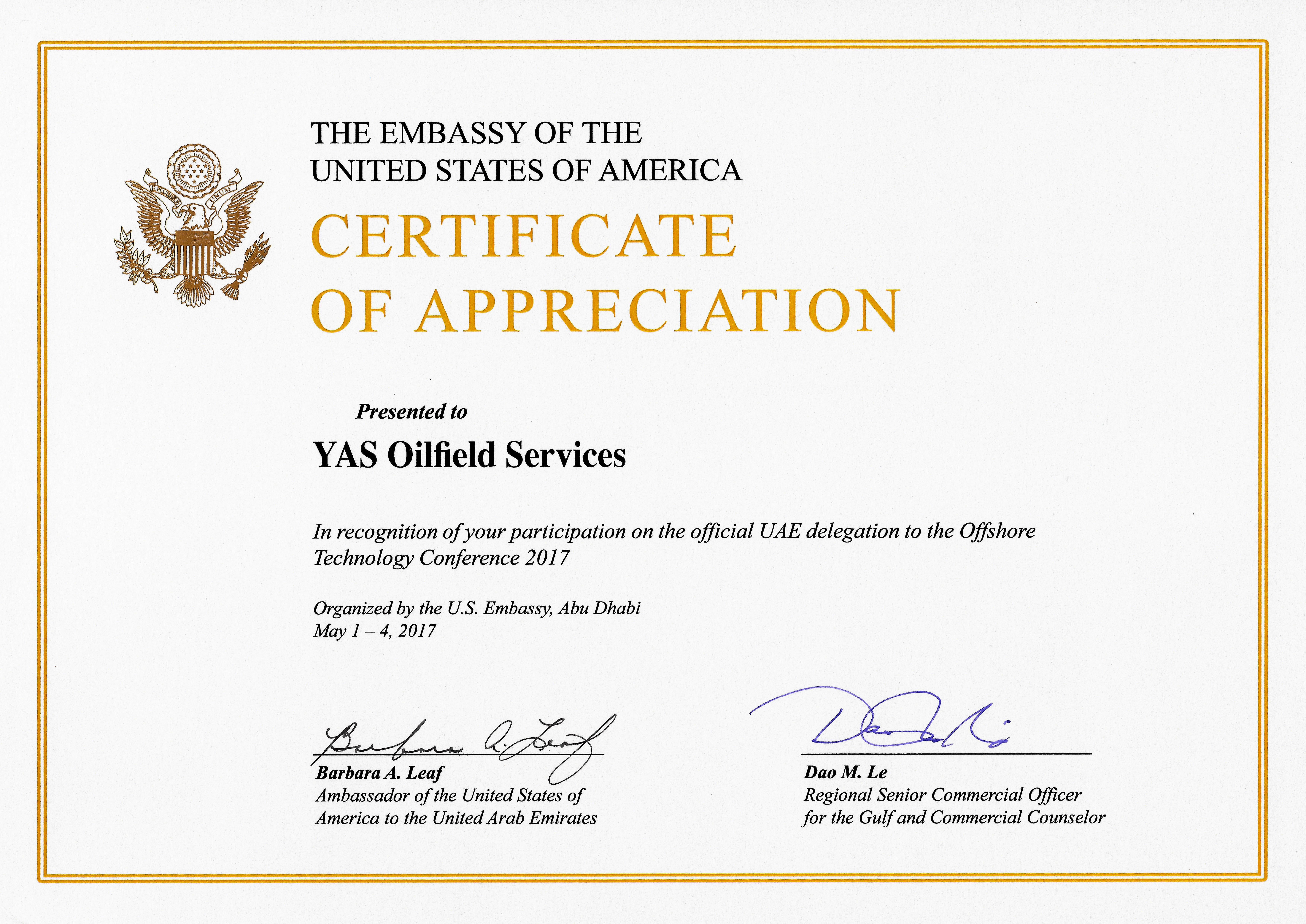 NRG Park, Houston, Texas, USA (May 1, 2017, Monday) - YAS Oilfield Services participated in the UAE Official Delegation to the OTC